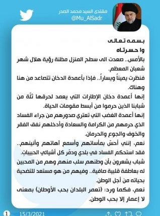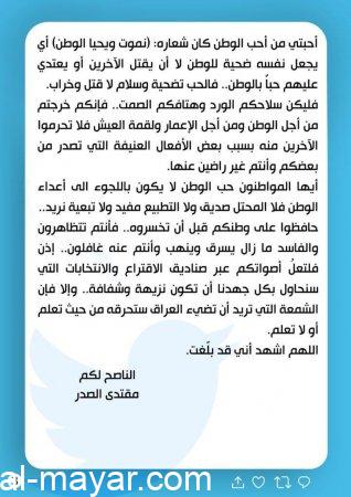 أكد زعيم التيار الصدري السيد مقتدى الصدر في تغريدة له على تويتر أن حرق الاطار وقطع الطرق وترهيب المارة لا يوجد فيه أي إعمار.
