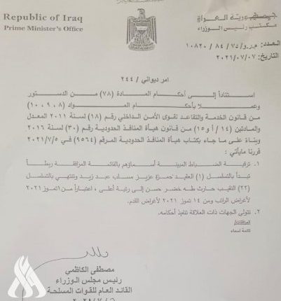 وافق القائد العام للقوات المسلحة رئيس الوزراء مصطفى الكاظمي، على ترقية ضباط هيئة المنافذ الحدودية.