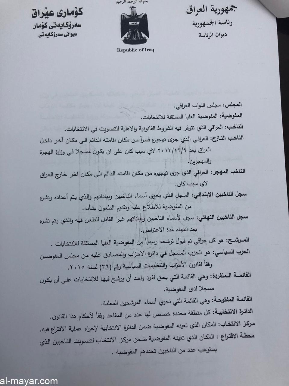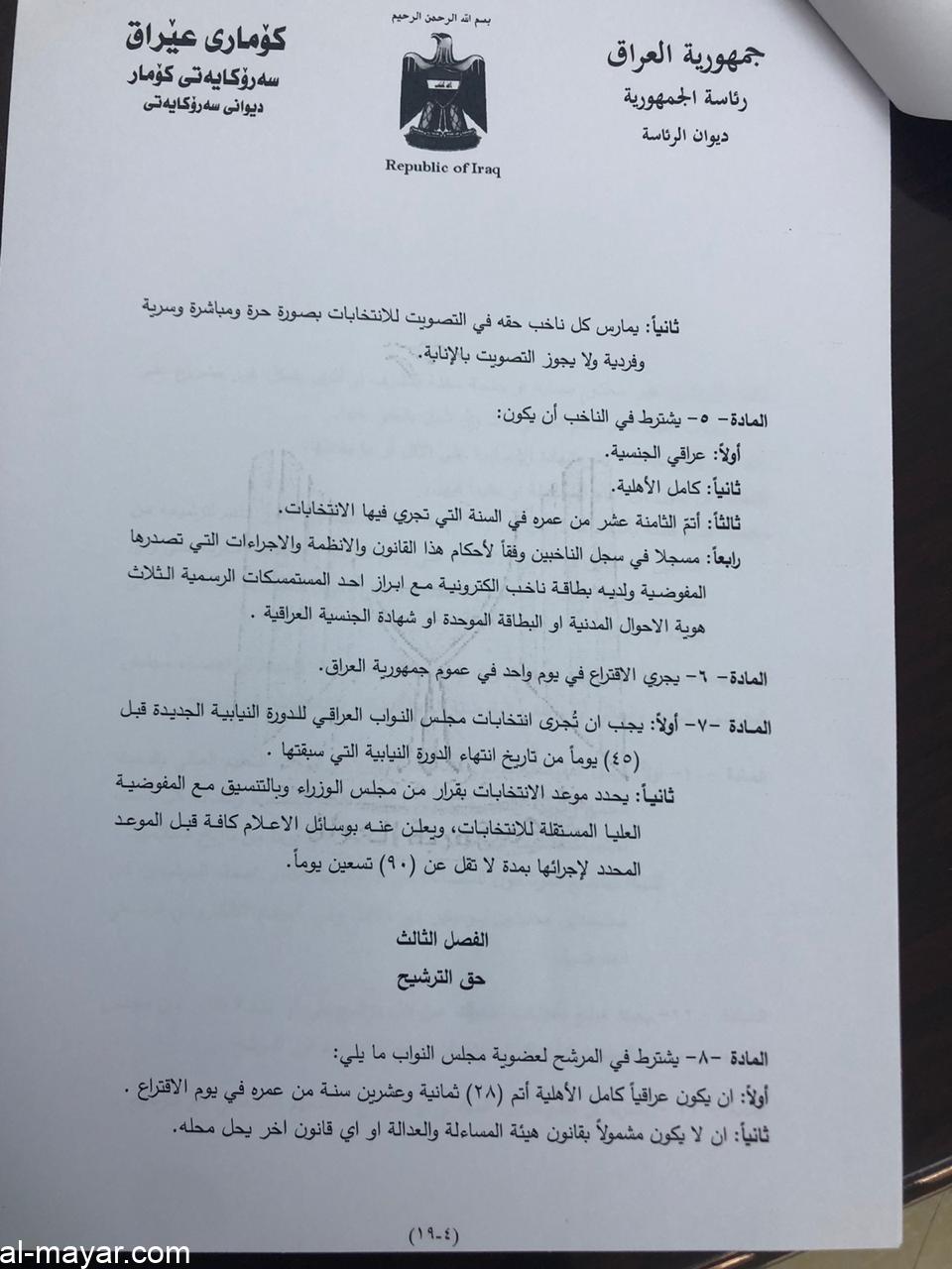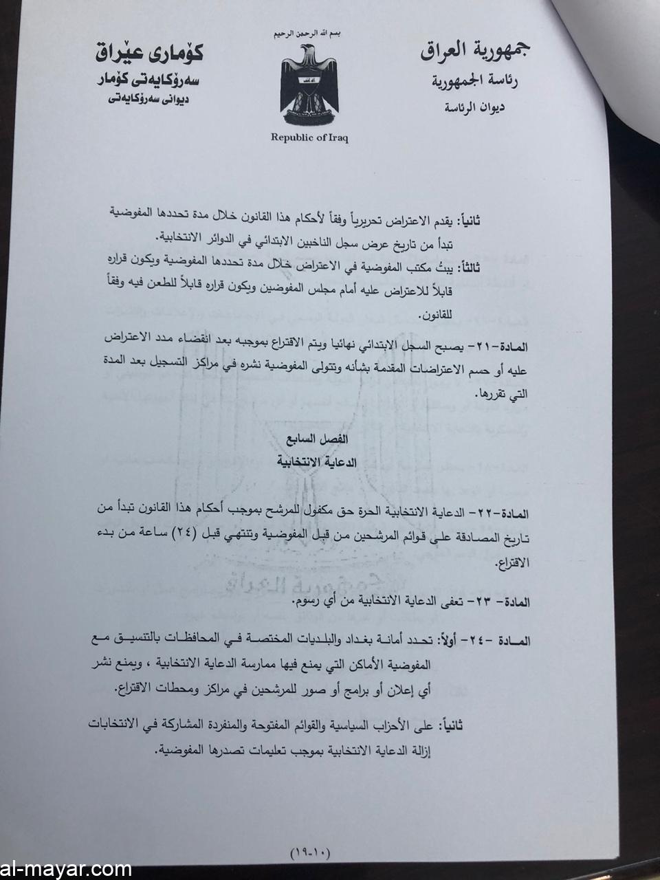 صادق رئيس الجمهورية الدكتور برهم صالح، اليوم الخميس، على قانون الانتخابات.