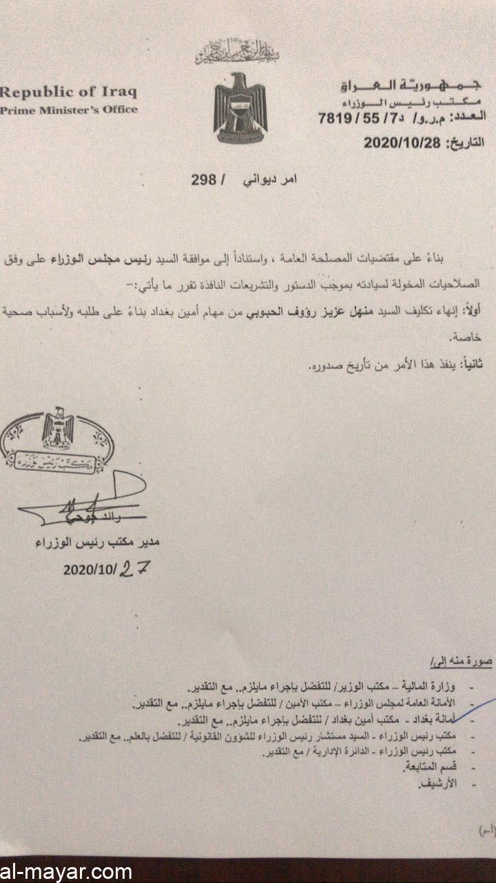 كلَّف رئيس الوزراء مصطفى الكاظمي علاء كاظم العماري أمينًا لبغداد خلفًا لمنهل الحبوبي الذي اِستقال من منصبه لأسباب صحية.